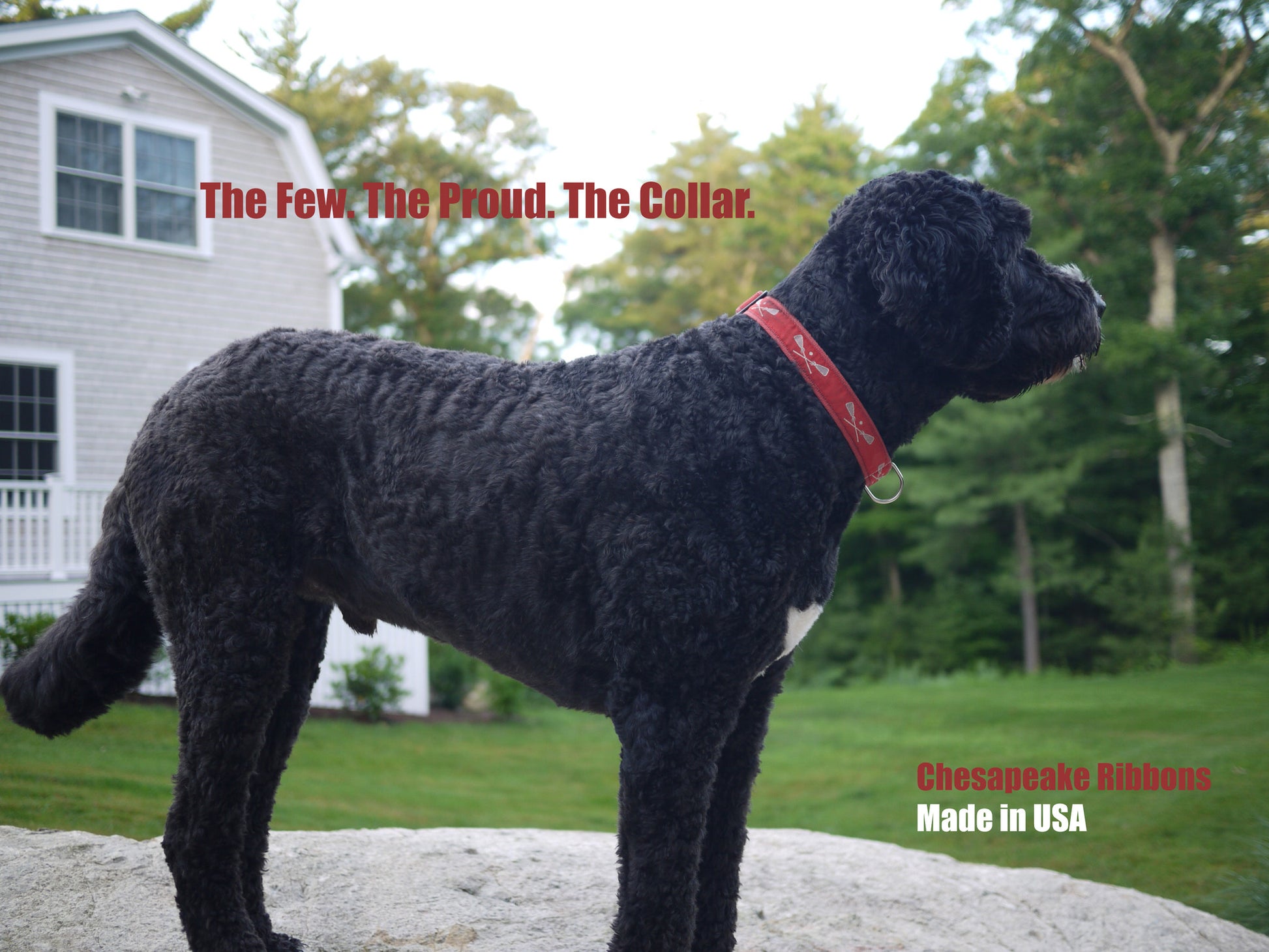 This adjustable ribbon dog collar is made with jacquard ribbon, heavy duty red cotton webbing, and break-away buckle snap. The collar measures 1.25" wide.